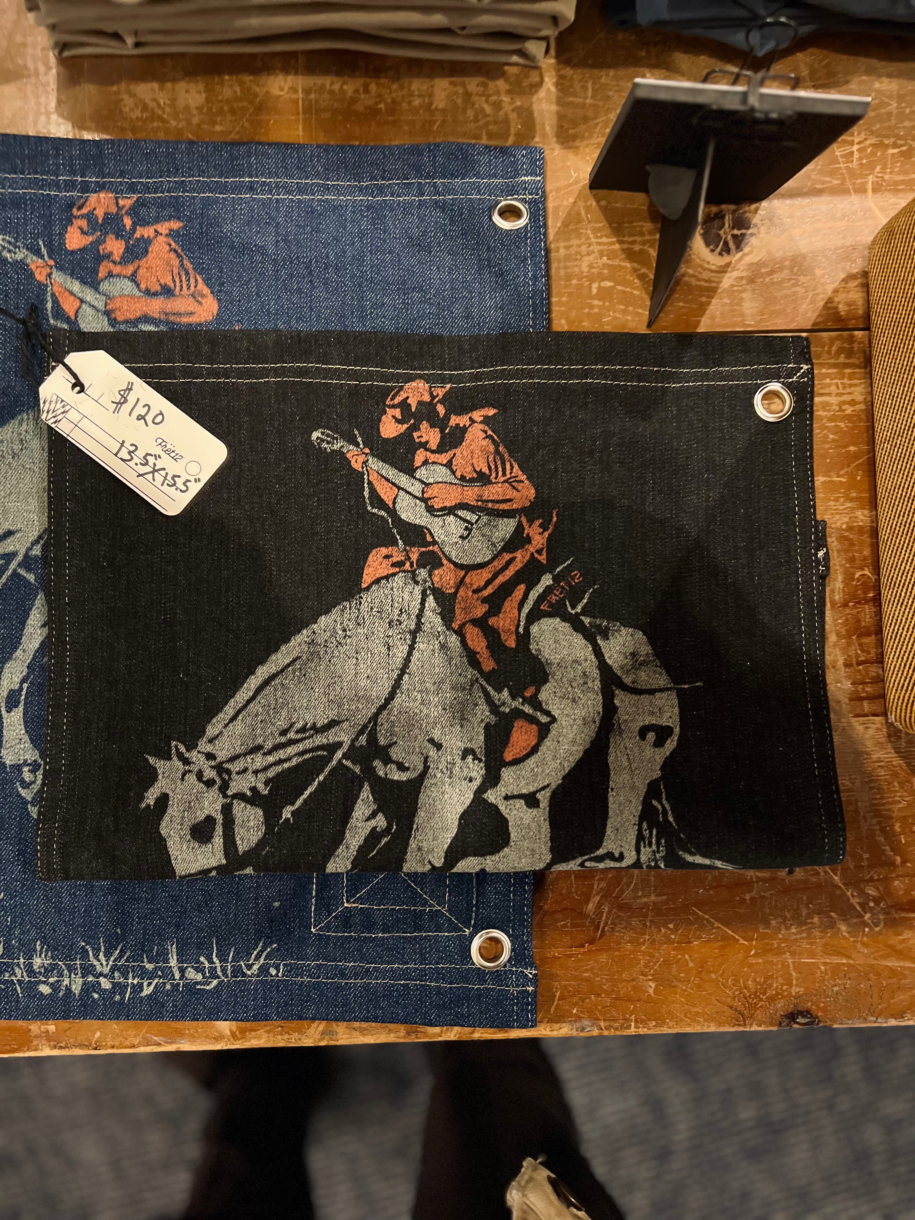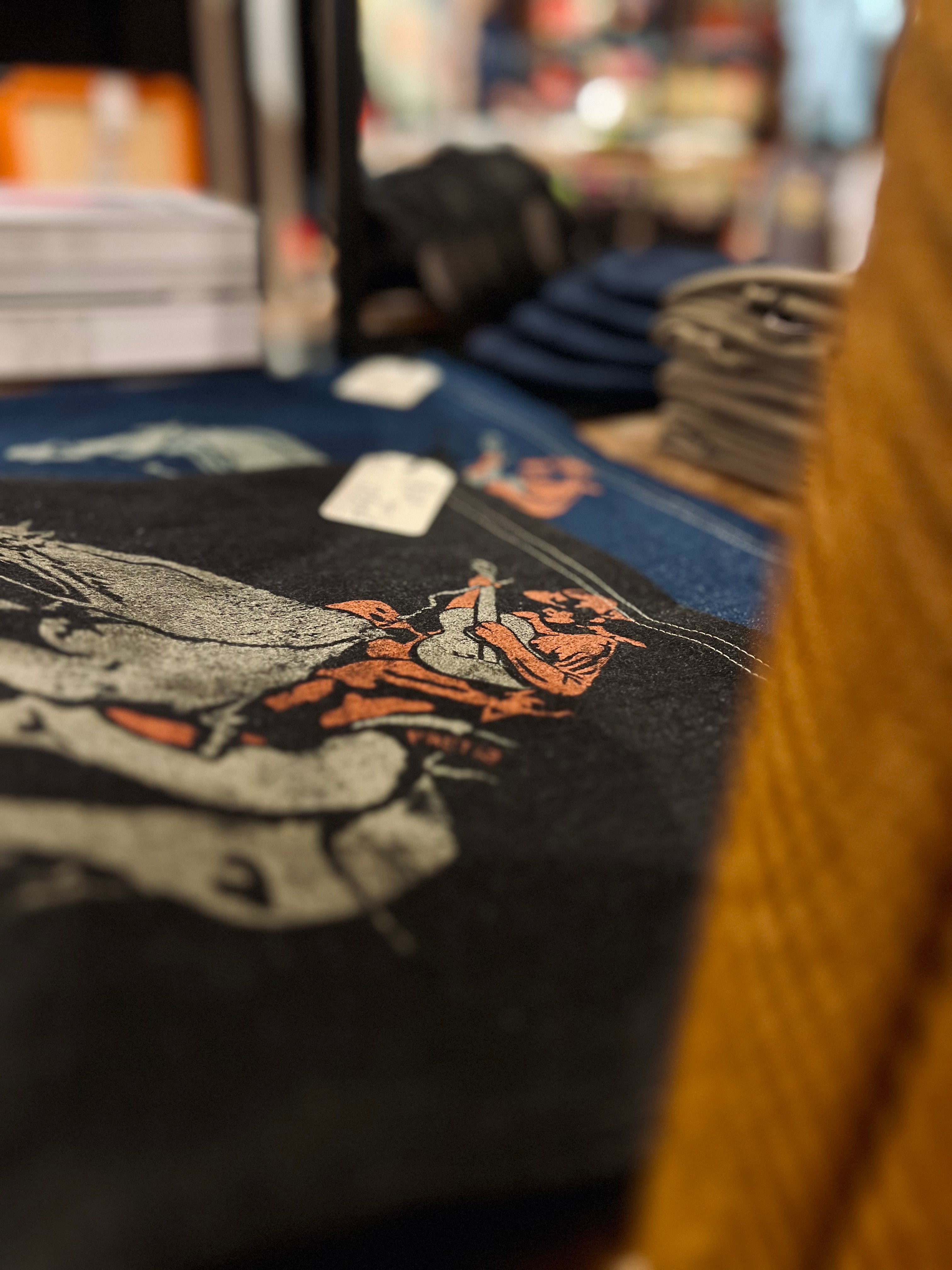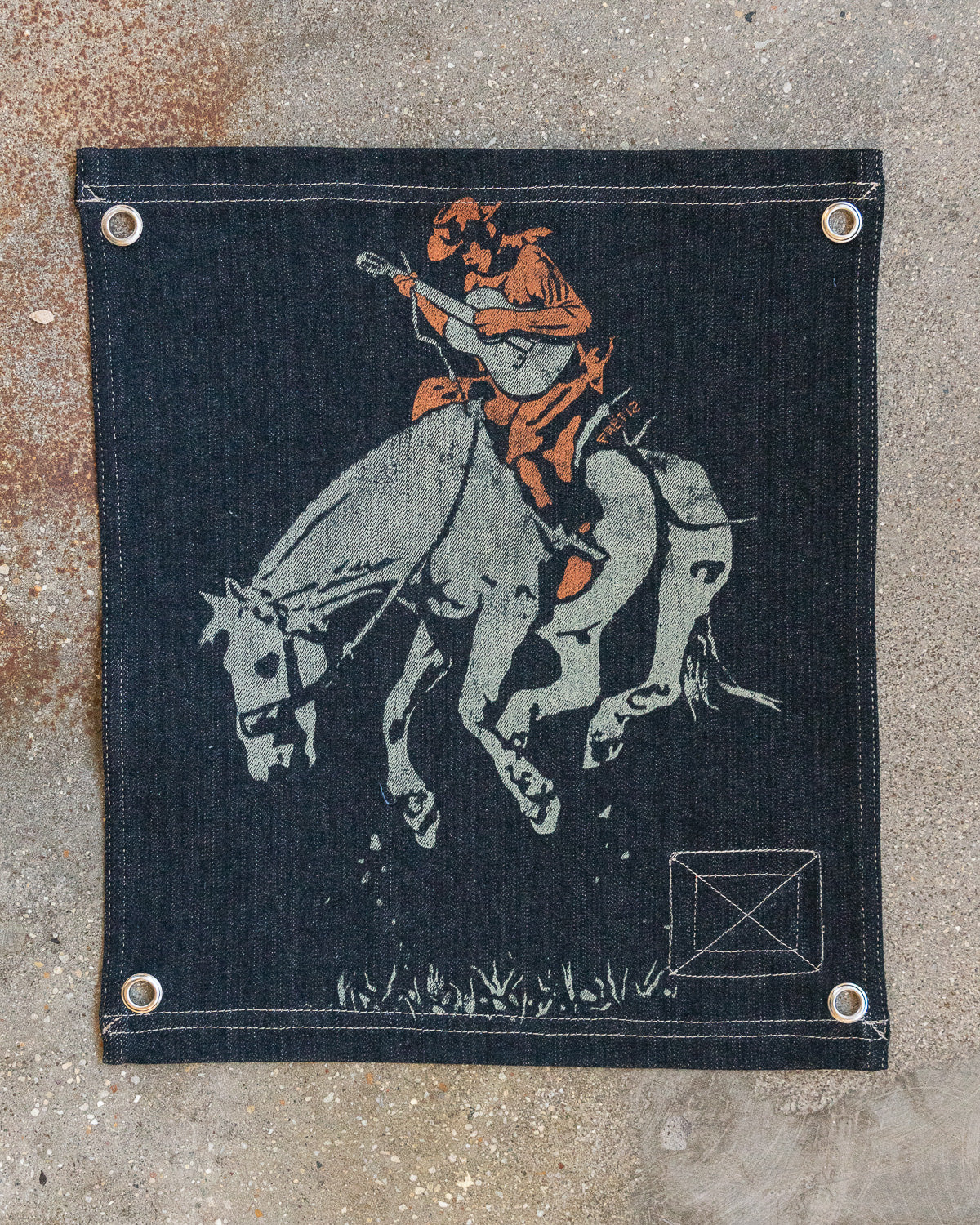 The Bucking Bronco pennant depicts the pioneering spirit of guitar players who push their limits. Hand drawn artwork captures the rugged character of the wild west with a bit of whimsy. While some may saddle up to follow the latest cowboy trend, guitar has been a staple on the frontier for nearly a century.